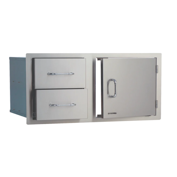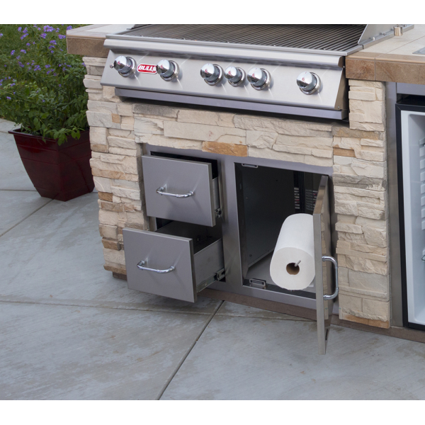 The Bull 97cm Door/Drawer Combo (Model #55875) is a premium addition to your outdoor kitchen, offering both functionality and durability. Crafted from 304-grade 16-gauge stainless steel, this unit features a double-lined door and two fully enclosed drawers, providing ample storage for your grilling accessories and cleaning products.